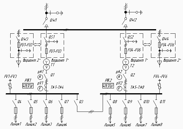 Электрическая схема 2КТП ПК(В) без секционирования по высокой стороне